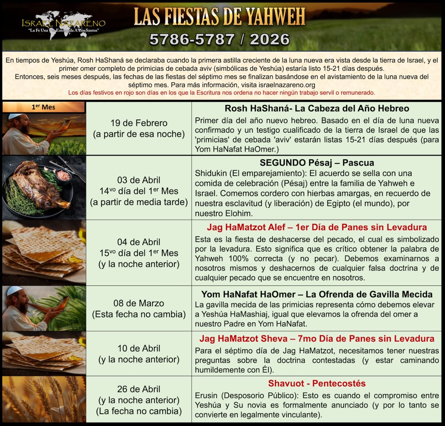 ¡ACTUALIZACIÓN! 8 de marzo de 2026: La luna nueva se avistó desde Israel la noche del 18 de febrero. En ese momento, ningún grupo de observadores de cebada informó de la presencia de cebada “aviv” en la Tierra de Israel, por lo que declaramos un duodécimo mes. El 5 de marzo recibimos información de Sighted Moons que nos obliga a revocar la decisión anterior y a declarar la próxima luna nueva (prevista para el 20 de marzo) como el segundo mes hebreo. IN celebrará un segundo Pésaj este año. (Las fechas dependen de la confirmación del nuevo mes). Por favor, consulta la publicación para obtener todos los detalles.