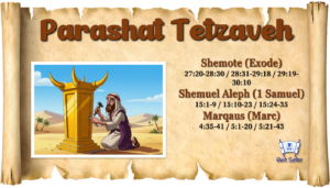 | 20 | Tetzaveh “Et tu donneras cet ordre [aux enfants d’Israël]” | 1) Exode 27:20-28:30 2) 28:31-29:18 3) 29:19-30:10 | 1) 1 Samuel 15:1-9 2) 15:10-23 3) 15:24-35 | 1) Marc 4:35-41 2) 5:1-20 3) 5:21-43 | |