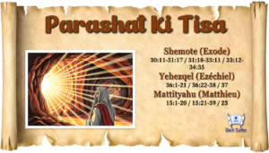| 21 | Ki Tisa “Lorsque vous participez au recensement” | 1) Exode 30:11-31:17 2) 31:18-33:11 3) 33:12-34:35 | 1) Ezéchiel 36:1-21 2) 36:22-38 3) 37 | 1) Matthieu 15:1-20 2)15:21-39 3)23 | |