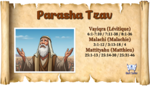 | 24 | Tzav “Ordre” | 1) Lévitique 6:1-7:10 2) 7:11-38 3) 8:1-36 | 1) Malachie 3:1-12 2) 3:13-18 3) 4 | 1) Matthieu 25:1-13 2) 25:14-30 3) 25:31-46 | |