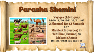 | 25 | Shemini “Le huitième [jour]” | 1) Lévitique 9:1-10:11 2) 10:12-11:32 3) 11:1-47 | 1) 2 Samuel 6-7 2) Proverbes 23 3) Psaume 78 | 1) Actes 10:1-23 2) 10:24-33 3) 10:34-48 | |