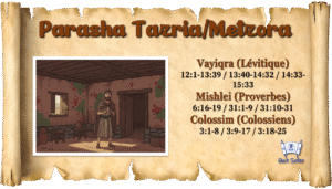 | 26 | Tazria/Metzora “Quand [une femme] conçoit” / “Lépreux” | 1) Lévitique 12:1-13:39 2) 13:40-14:32 3) 14:33-15:33 | 1) Proverbes 6:16-19 2) 31:1-9 3) 31:10-31 | 1) Colossiens 3:1-8 2) 3:9-17 3) 3:18-25 | |