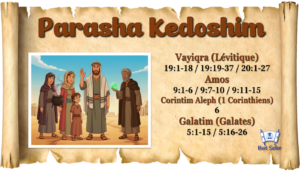 | 28 | Kedoshim “Les Saints” | 1) Lévitique 19:1-18 2) 19:19-37 3) 20:1-20:27 | 1) Amos 9:1-6 2) 9:7-10 3) 9:11-15 | 1) 1 Corinthiens 6 2) Galates 5:1-15 3) 5:16-26 | |