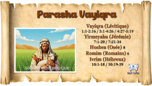 | Vayiqra | 23 | Vayiqra “Et Il [Yahweh] a appelé” | 1) Lévitique 1:1-2:16 2) 3:1-4:26 3) 4:27-5:26 | 1) Jérémie 7:1-20 2) 7:21-34 3) Osée 8 | 1) Romains 6 2) Hébreux 10:1-18 3) 10:19-39 |