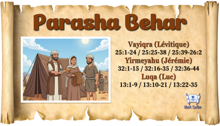 Cette semaine, nous étudierons la parasha Behar, la portion de la troisième année, où nous verrons comment Yahweh nous enseigne à traiter ceux qui sont dans le besoin avec justice et compassion. Nous découvrirons la libération des serviteurs et l’importance d’aider nos frères et sœurs sans en abuser. Nous lirons comment l’année du jubilé apporte espoir, réparation et repos, nous rappelant que tout appartient à Yahweh. Nous verrons également l’importance d’obéir à Ses commandements, d’observer le sabbat et de respecter Son sanctuaire. Ensemble, nous apprendrons que la fidélité et la miséricorde apportent bénédiction et stabilité au peuple.