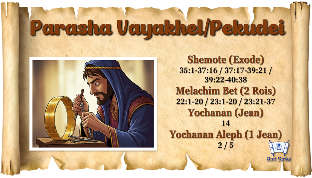 Dans la parasha Vayakhel/Pekudei, portion de l’année 3, consacrée à Yahvé, nous verrons comment les Israélites préparent avec soin les vêtements sacrés et les ustensiles du tabernacle selon les instructions de Yahvé. Nous apprendrons comment Moïse vérifie que tout est…